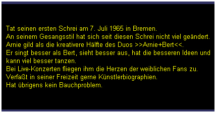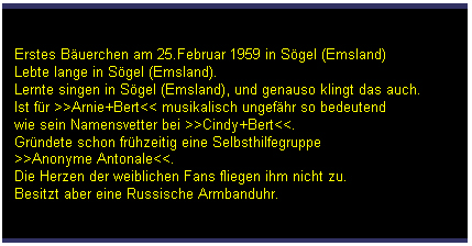 ![]() Berts Biographie: ![]() Ebenso gebürtiger wie überzeugter Bremer und folgerichtig glühender Fan von Werder Bremen, obwohl das manchmal gar nicht so einfach ist. Wollte seit seinem 12. Lebensjahr Radiomoderator werden und ist deshalb Radiomoderator geworden. Seit 1991 2.Karriere als "bessere Hälfte" der Original Deutschmacher, an denen er besonders mag, daß er auf der Bühne so sein darf, wie er sowieso schon ist. Schläft gern bei offenem Fenster. Ein Emsländer, wie er im Buche steht, aber gottseidank gibt es keine Bücher über Emsländer. Ist kein Fußballfan, weil - wie soll das gehen im Emsland? Wollte mal Lehrer werden und ist deswegen Radiomoderator geworden. Seit 1991 2.Karriere als "andere bessere Hälfte" der Original Deutschmacher, an denen er besonders mag, daß er als Deutschmacher sogar bei Liveauftritten die Texte ablesen darf, die er aus unerfindlichen Gründen nur im äußersten Notfall auswendig lernt. Besitzt eine russische Armbanduhr. Die Deutschmacher-Chronik: